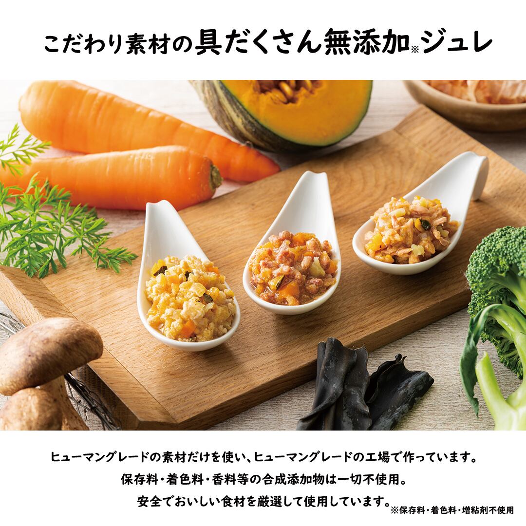 ヒューマングレードの原材料を使用し、無添加で作られています。肉や魚をメインにかつお・昆布・しいたけの合わせ出汁を使用し、香りも抜群。よりドライフートに絡めやすいジュレ仕立てなので、いつものドライフードにちょっとプラスするとグルメごはんの完成!少量&個包装なので、トッピングがはじめてのパートナー(愛 犬)や、食いつきアップしたいパートナーにおすすめです。トッピングとしてだけでなく、お散歩やお出かけ時の「持ち運べるおやつ」としても話題◎冷凍して夏場のクールダウン&水分補給に、温ジュレにして寒い日の隠れ脱水予防にどうぞ。